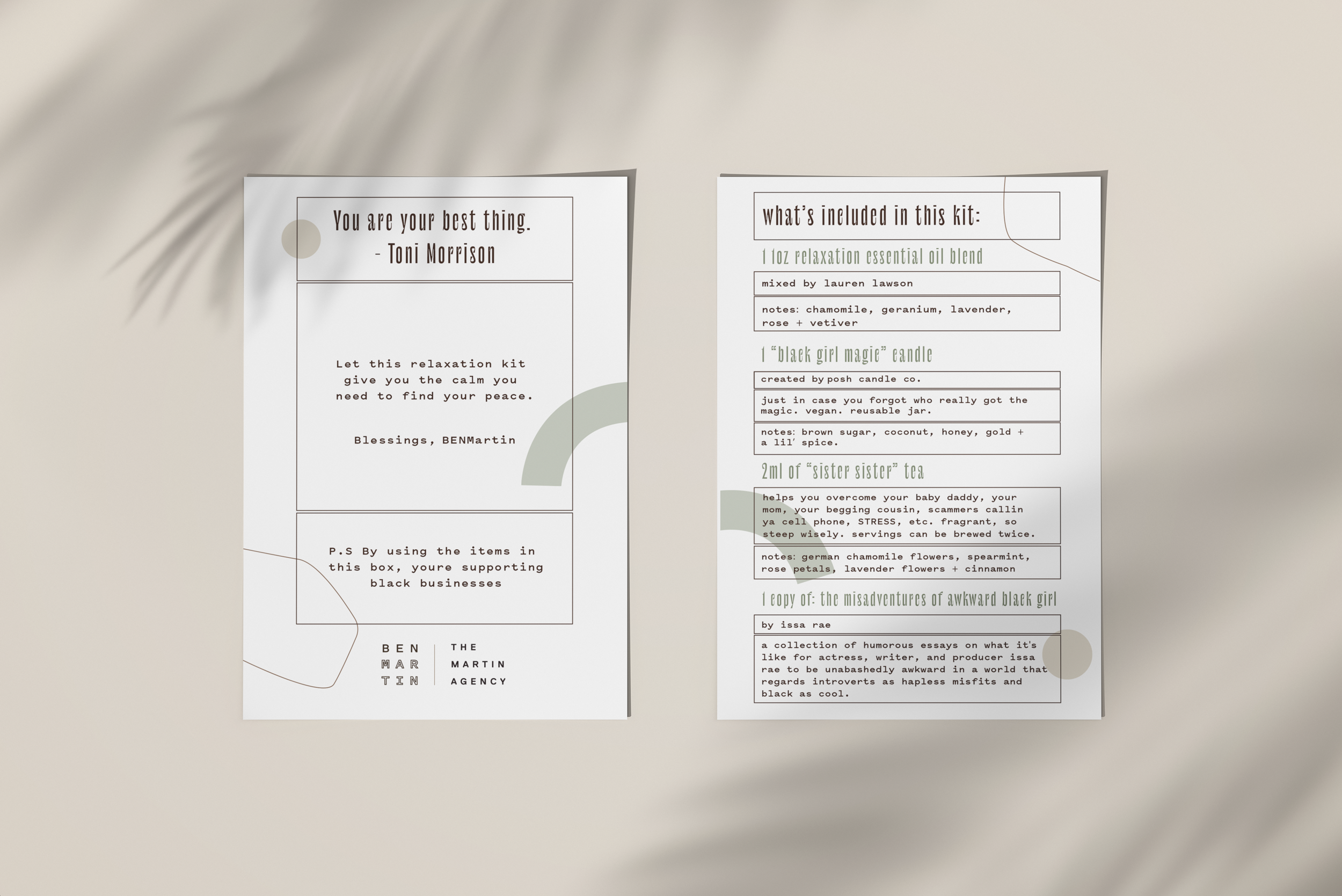 every employee was gifted a handmade self-care kit that products exclusively from black-owned businesses. the kit included a book, candle, tea, essential oil + card.